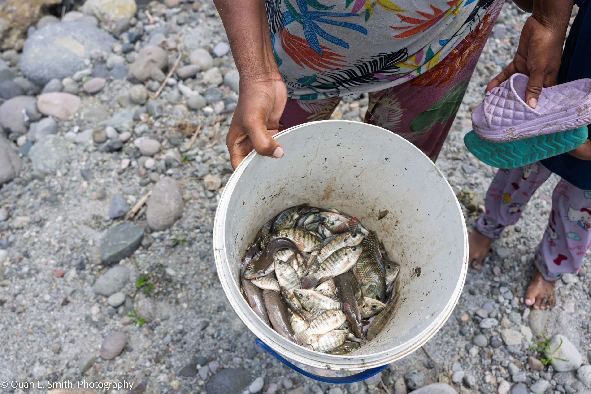 The fisherman’s wife and daughter holds a white bucket filled with freshly caught fish by the riverside. The photo highlights a successful fishing day and shows one of the ways the Aeta Mag-antsi tribe gathers food from nature.